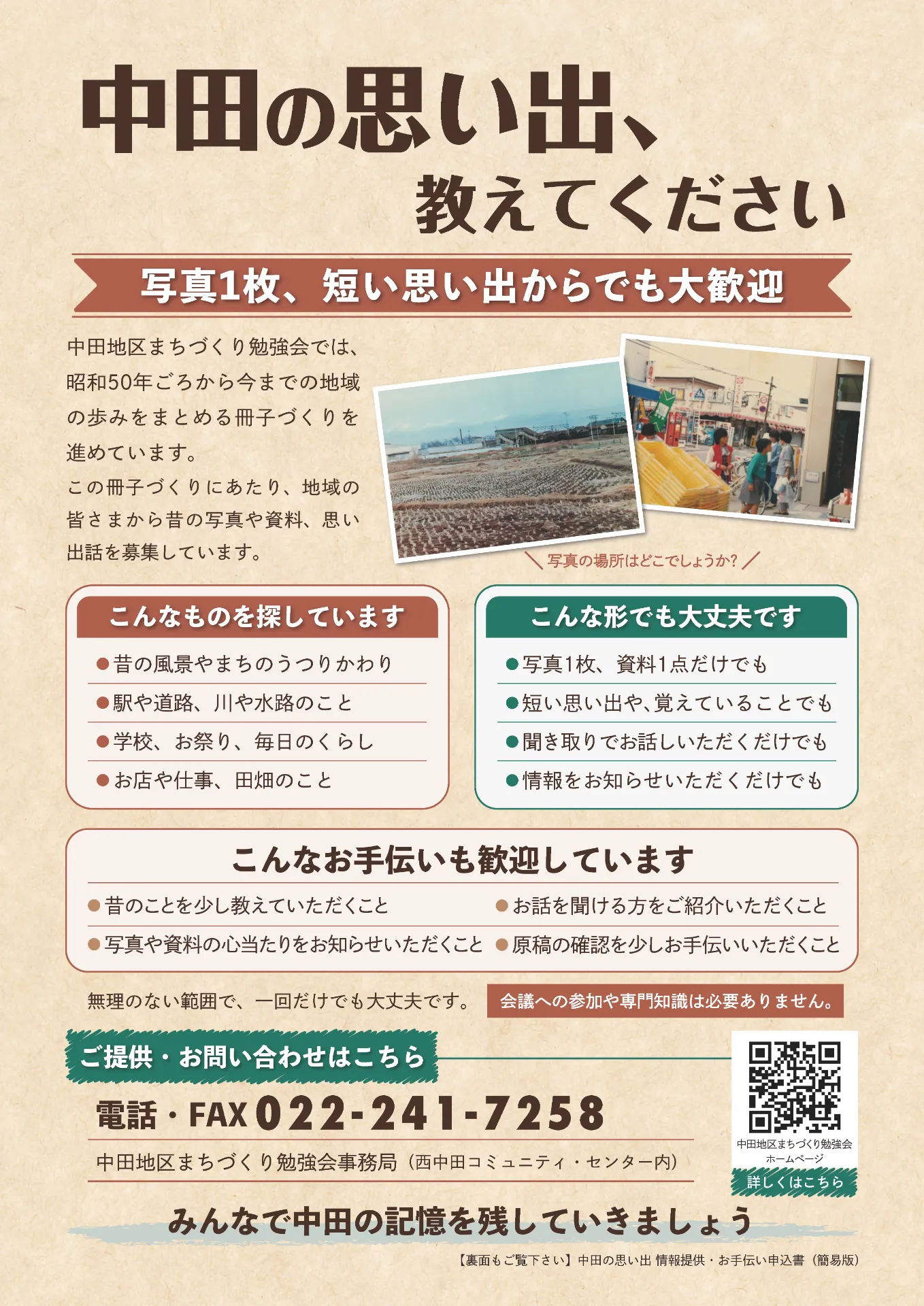 昔の写真、資料、思い出話、ちょっとした情報がありましたら、ぜひお知らせください。